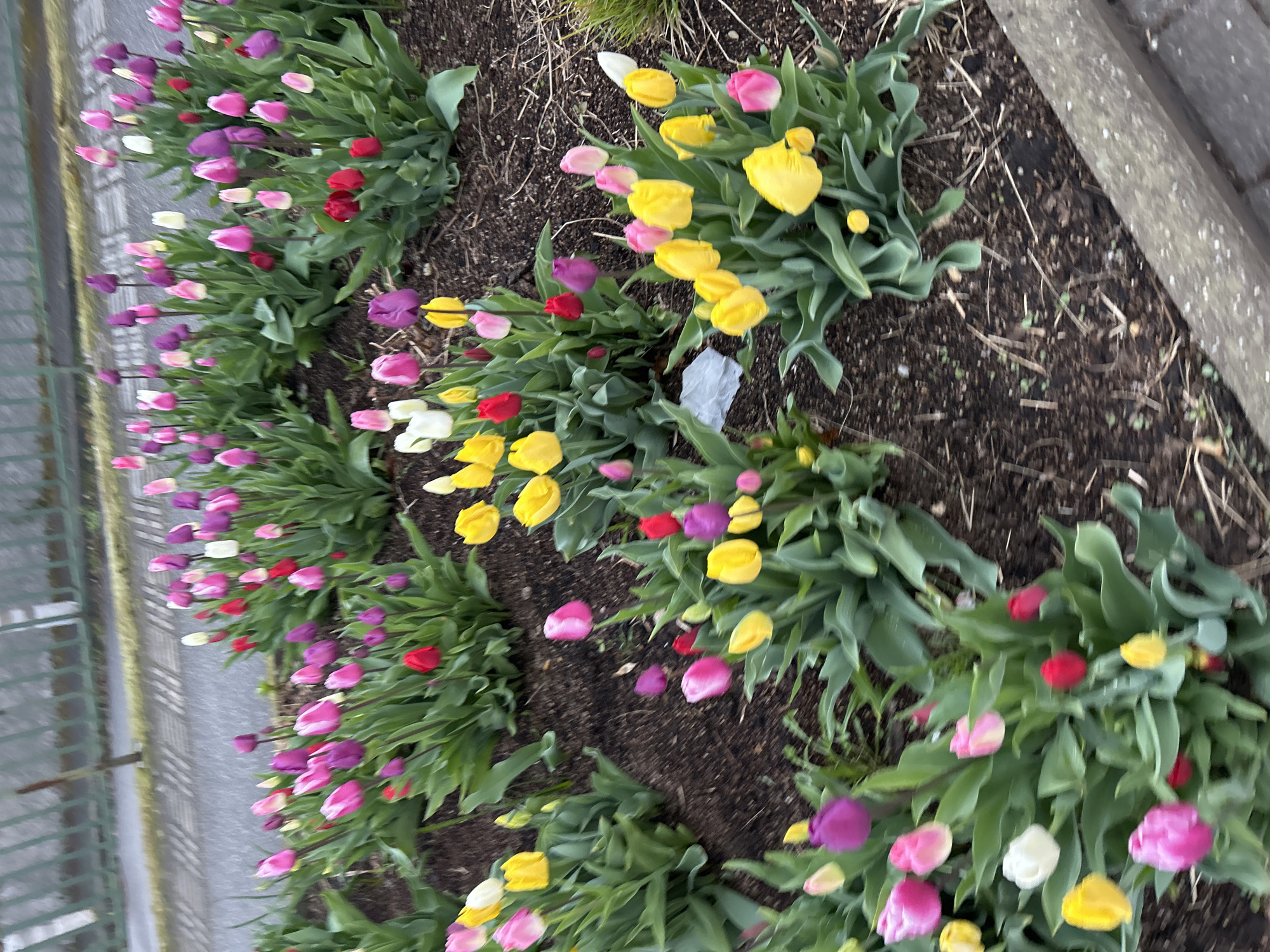 A row of tulips in a variety of colors (pink, purple, red, white, and yellow) is arranged along a strip of dirt bordering a sidewalk and a concrete edge