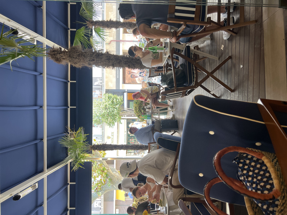 The image captures a daytime scene at an outdoor dining area in Forte dei Marmi, Italy, evidenced by the prominent "ROLEX" and "BRUNELLO CUCINELLI" storefronts visible across the street. The patio is covered by a blue fabric canopy with integrated linear heaters and features dark wooden deck flooring. Multiple individuals are seated at white tables utilizing various seating types, including dark blue upholstered armchairs with white piping (one in the foreground holds a woven basket bag with a patterned cloth) and wooden chairs with blue and white striped cushions. Potted palm trees are strategically placed throughout the seating area. From left to right in the mid-ground: A young female in a white top is actively eating a sandwich. Adjacent to her, a young male in a white baseball cap with a "Callaway" logo and a light-colored shirt is seated, facing away from the camera. Further back, a man in a light blue shirt sits with a dark bag or piece of luggage next to his chair. To his right, a woman with bright pink hair, dressed in a light-colored garment, is engaged with her mobile phone. On the right side of the frame, a woman with dark hair and glasses, wearing a white patterned t-shirt, holds a green bottle, with a pack of cigarettes and a lighter on her table. Opposite her, a man in a dark polo shirt is seated, facing her. A staff member in a white shirt is partially visible in the left background. The scene depicts a casual social gathering where patrons are observed eating, drinking, and interacting.