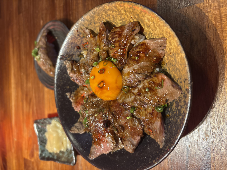 The image displays a high-angle, close-up view of three food items served on a dark, reddish-brown wooden table. In the foreground, a black ceramic bowl with a speckled gold-brown interior holds a Japanese-style donburi. This dish features white rice topped with numerous thin slices of seared beef, exhibiting varying degrees of doneness with some pinkish centers and a glossy, dark brown sauce. A vibrant orange raw egg yolk rests centrally atop the beef, garnished with finely chopped green scallions and small red spice flakes. To the upper left, a small, dark, irregularly shaped ceramic dish contains a pile of pale yellow pickled ginger. In the blurred background, to the upper right, a small dark plate holds a single piece of nigiri sushi, topped with a slice of seared beef and a green onion garnish. The scene is illuminated by warm, dim lighting, indicating an indoor restaurant environment located in Bangkok, Thailand.