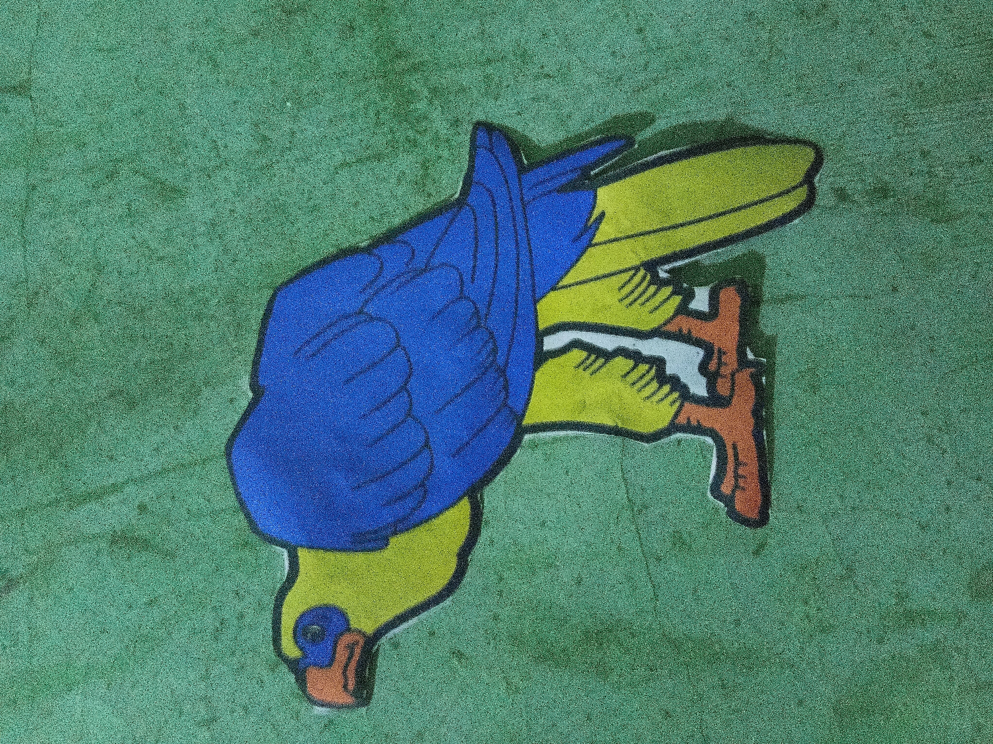 A cartoon bird with blue wings and a yellow body is depicted against a green surface. The bird is upside down, with its head pointing towards the lower left and its legs extended upwards on the right. The background is a solid green color, possibly a carpet or floor. The location is Unknown, Unknown.