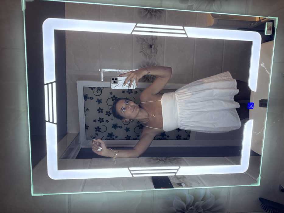 A mirror reflects a woman holding a phone. She wears a white dress and gold jewelry, including a necklace with a star pendant. The mirror has a built-in light frame, reflecting the tiled bathroom walls and a window with a floral pattern. The woman's reflection shows her holding the phone up and taking a selfie.