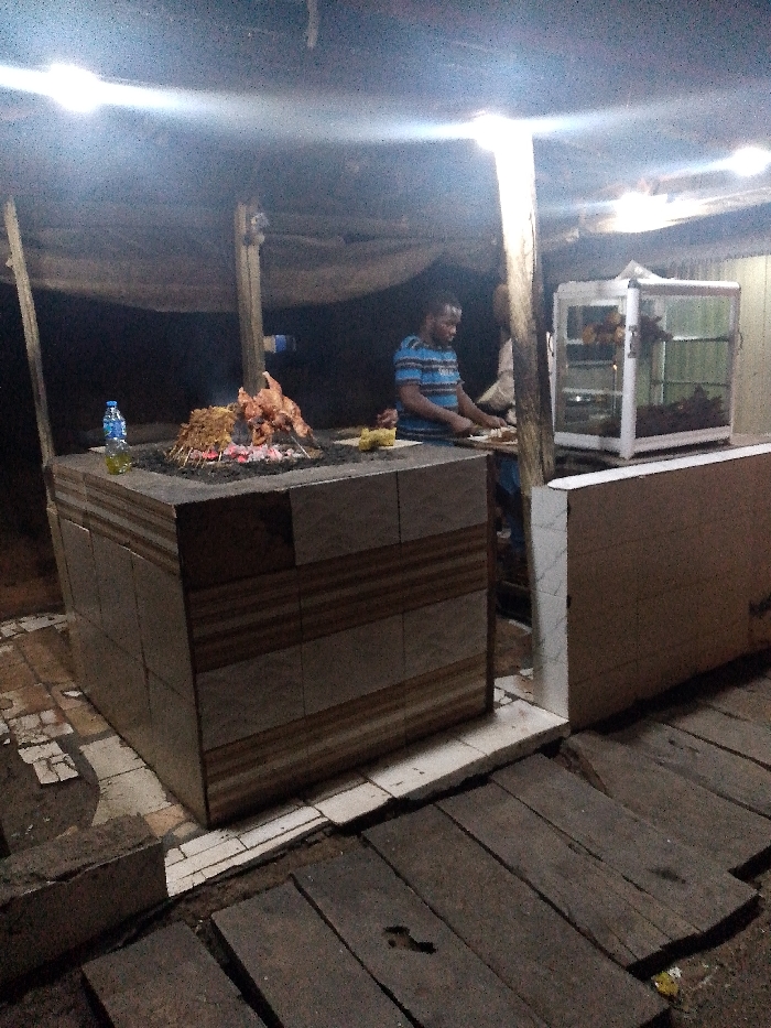 A dimly lit outdoor eatery features a tiled grilling station topped with glowing coals, skewers, and whole grilled chickens. A man in a blue striped shirt works beside the grill, preparing food. A small display case containing grilled items sits next to a tiled counter. The flooring transitions from cracked tiles to weathered wooden planks. A bottle of water rests on the grilling station.