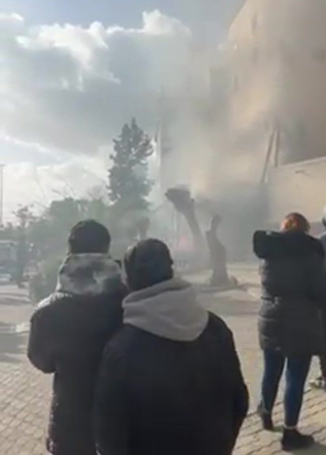 building engulfed in flames, with heavy smoke billowing into the air. Several people are standing on a paved area, observing the fire. Some individuals are wearing jackets with hoods, while others are wearing other types of jackets. A tree stands partially in front of the burning building. The sky is overcast, and the sun is obscured by clouds.