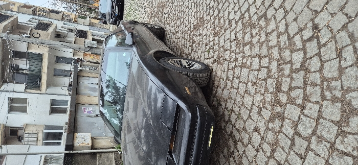The image depicts a static street scene in Sofia, Bulgaria. A black, third-generation Pontiac Firebird Trans Am is prominently parked on an uneven cobblestone surface, which is interspersed with dry vegetative debris. The vehicle is angled with its front-left quarter towards the viewer, displaying its retracted pop-up headlights and aftermarket LED daytime running lights installed below the front bumper. The car's exterior shows evidence of dust or grime accumulation. In the background, a light-colored, multi-story residential building with several balconies, some enclosed, and visible external air conditioning units dominates the mid-ground. Below the residential building, a lower structure, consistent with garages, features a light-colored wall with a red and white sticker affixed. Utility poles and overhead lines are visible vertically along the right side of the frame. A dark-colored modern SUV is partially visible, parked further down the cobblestone street in the upper right portion of the image. No individuals are present in the scene, and no actions or interactions are occurring.