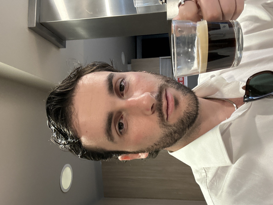 A male subject, appearing to be in his 20s or 30s, with dark wavy hair and a trimmed beard, is captured in a close-up, chest-up selfie format, looking directly at the camera