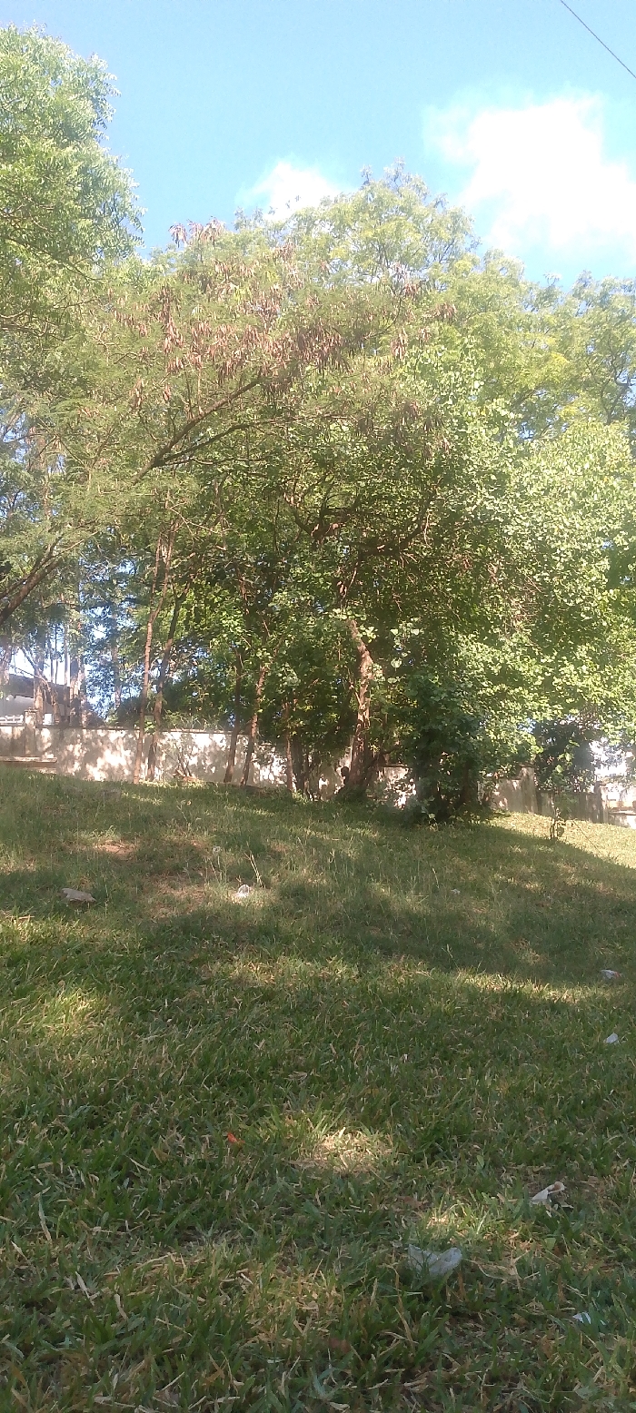 The image displays an outdoor scene in Tudor ward, Kenya, under a bright sky with sparse white clouds. The upper and mid-sections are characterized by dense tree canopy, featuring various green-leafed trees. A prominent tree in the upper center is laden with numerous elongated, dried brown seed pods. Below the tree line, a light-colored, possibly concrete, wall stretches horizontally across the background, partially obscured by foliage. The foreground and lower two-thirds of the image show a gently sloping grassy area, exhibiting varied shades of green and some drier patches. Sunlight casts distinct shadows from the trees onto the grass. Sparse litter, including small white and brown fragments, is visible on the grass. No individuals or specific activities are depicted.