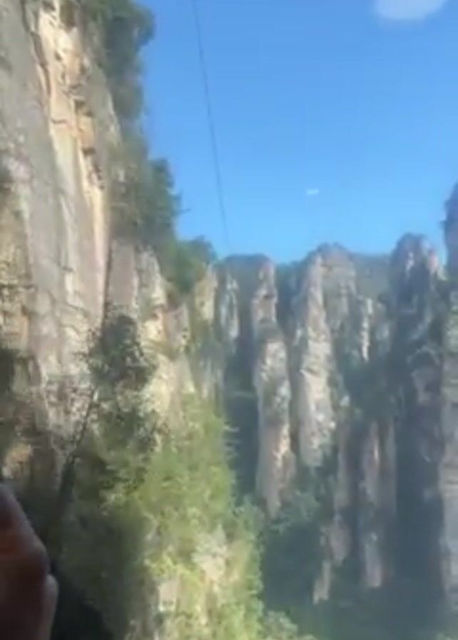 The video, filmed from inside a gondola car, presents a scenic view of tall, sandstone rock formations partially covered in greenery under a clear blue sky. The camera moves slowly, showcasing the height of the rock formations and the depth of the valley below. The interior of the gondola car is visible at the bottom of the frame, along with a partial view of a cell phone being used to record. Voices can be heard, adding an ambient auditory context to the visual scene.