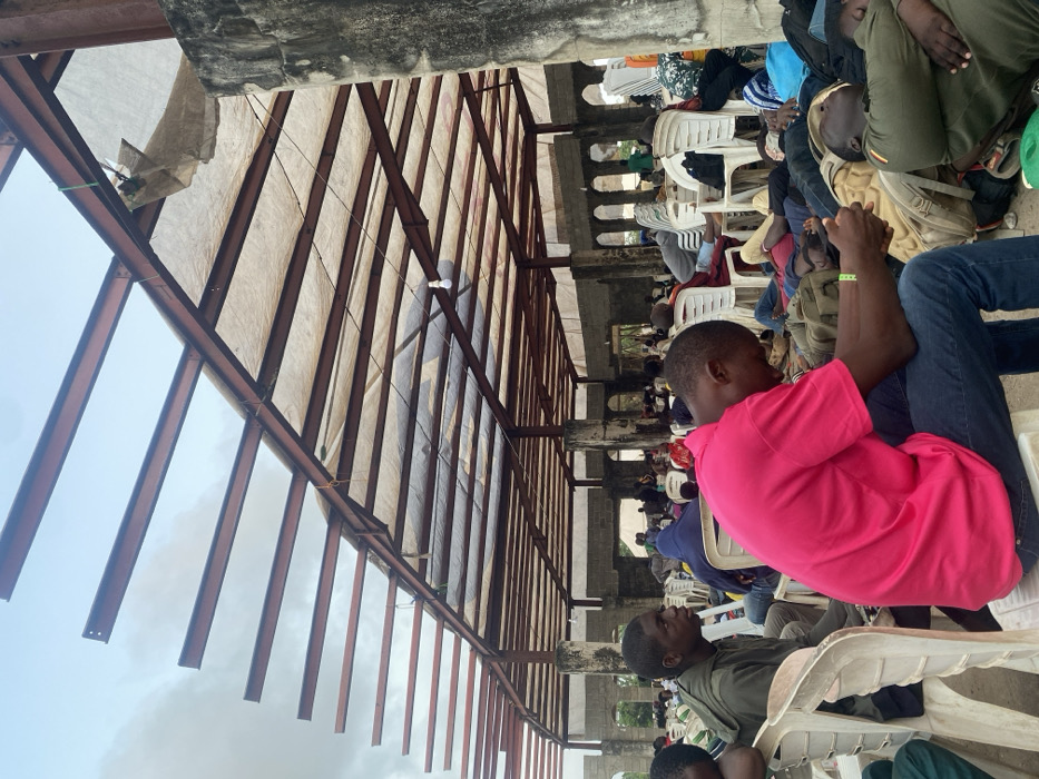 An outdoor gathering occurs under a partially covered shelter with exposed metal beams. Numerous people sit on white plastic chairs, filling the space. Some individuals are visible in detail, wearing casual attire like a pink shirt and jeans. The building's architecture features arched openings, and the sky is overcast, suggesting an informal event or meeting taking place outdoors.