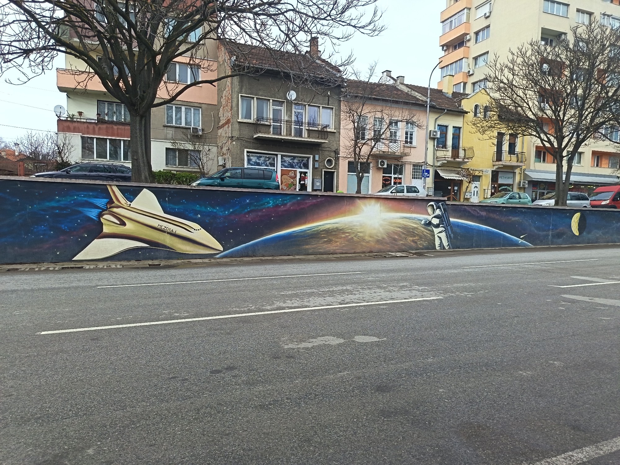 The image depicts a street scene in Mezdra, Bulgaria. A vibrant space-themed mural spans a low retaining wall bordering an asphalt road. The mural features a golden/tan space shuttle labeled "MEZDRA 1" on the left, a detailed Earth with a prominent sunrise/sunset horizon in the center, and a white-suited astronaut with a jetpack on the right, all set against a dark blue cosmic background with stars and colorful nebulae. A crescent moon is visible on the far right of the mural. The asphalt road occupies the lower portion of the frame, showing two parallel white solid lines. The road surface exhibits some scattered wet patches. No active traffic is present on the visible road section. Behind the mural wall, a street lined with buildings and bare-branched deciduous trees extends into the background under an overcast sky. From left to right, structures include a multi-story building with a light pink and white facade, followed by an older grey building featuring a "MAGAZIN" shopfront and a partially visible "RENAULT" sign, and another light pink building. Further right, a taller, multi-story yellow/beige building with a "PET SHOP" sign is visible. Several parked vehicles, including a dark minivan, a light-colored car, and a red van, are partially visible behind the wall and along the street.