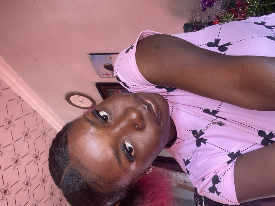 An indoor scene in Rido, Nigeria, shows a dark-skinned female, estimated to be an adult, positioned centrally and looking directly at the camera. She has dark hair with a visible part, with a section of pink-dyed hair visible on her left side. Her face displays a slight smile, glossy lips, and a small stud piercing in her nose. She is wearing a light pink short-sleeved t-shirt adorned with a pattern of black bows and dotted lines. A gold-colored chain necklace with a clover-shaped pendant hangs around her neck, and a small silver-colored stud earring is visible on her left earlobe. The background consists of light pink walls and a white ceiling featuring a repeating geometric pattern. Visible on the wall are a round analog clock with a dark frame and white face, a larger dark-framed item (possibly a picture or mirror), and a smaller framed picture depicting a light blue background with a figure. In the lower right corner of the image, silver and purple festive tinsel or garland is present.