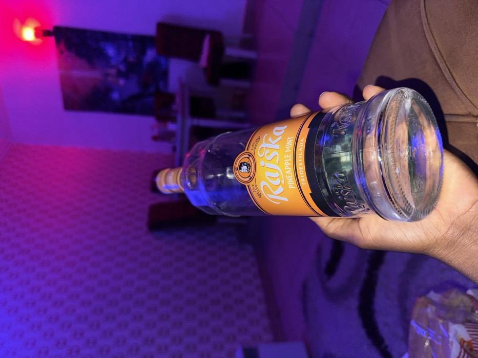 - "A person's hand holds a bottle of Rajska Pineapple Mint Tridestilada, a clear liquor" by FM-Nk0Z32, licensed under CC BY 4.0