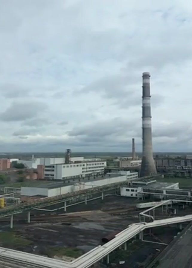n aerial view of an industrial complex under a cloudy sky. There are several buildings of varying sizes, primarily white and gray, with flat roofs. Numerous pipes run above ground. A tall, striped smokestack dominates the view, and another smaller one is visible in the distance. The foreground contains a metal structure, possibly part of the facility, and the ground appears to be wet.