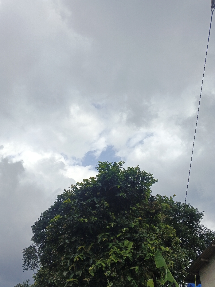 The scene captures an outdoor environment in Pinnwe, Myanmar (Burma). A large, densely foliated tree with dark green leaves occupies the lower two-thirds of the frame, extending towards the center and upper right. The sky above is largely covered by grey, heavy clouds, with a small, irregular patch of clearer blue sky visible near the upper center. A dark, insulated cable runs diagonally downwards from the upper right corner, where a partial fixture, possibly a street light, is visible. In the bottom right corner, a portion of a building structure, likely a light-colored wall or roof edge, is partially obscured by large green leaves, including one resembling a banana leaf. No human subjects or specific activities are observed.