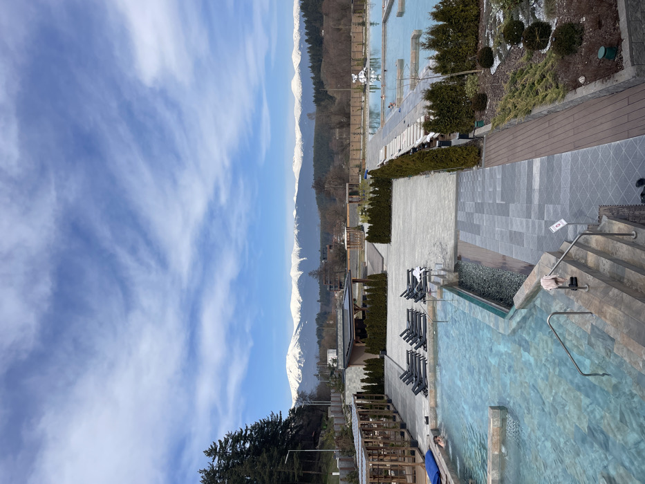 The image displays an outdoor thermal spa complex in Bania, Bulgaria, observed under a clear blue sky with scattered white clouds. The background is dominated by a horizontal range of snow-capped mountains, with a forested valley separating them from the foreground structures. In the foreground and midground, multiple interconnected outdoor swimming pools with light-colored tiled bases are visible. Approximately five individuals are partially submerged in the pools, engaging in recreational bathing. A pool in the foreground features integrated steps with metal handrails; a pink towel is draped over one railing. Adjacent to this pool, a single blue-cushioned chaise lounge rests on a paved area, and a row of ten dark-framed lounge chairs with white cushions is aligned on an adjoining grey tiled patio. The complex incorporates various paved walkways, some with distinct geometric patterns, and landscaped sections containing neatly trimmed evergreen hedges and smaller shrubs. Several open-sided wooden pergola structures are present. A central building with a dark roof and wooden accents is positioned amidst the pathways. In a more distant, larger pool area to the right, a prominent white, bear-shaped sculpture is visible. To the far left, a dense line of evergreen trees covers a hillside, with a road and a single lamppost visible at its base.