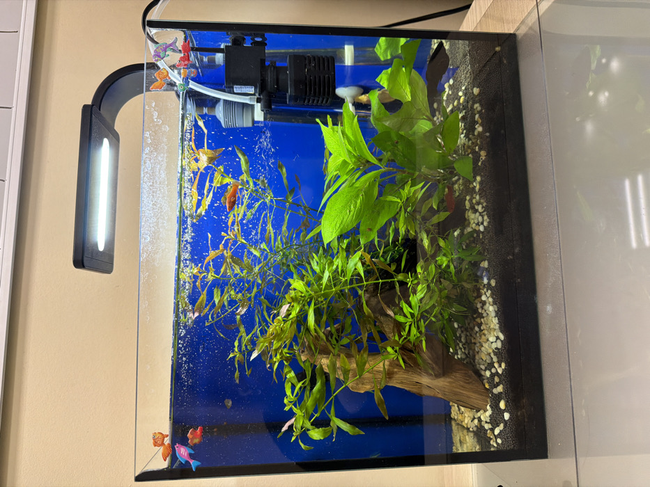 A rectangular glass aquarium is centrally positioned, containing water with numerous air bubbles primarily on the left side and surface. The background of the aquarium is a solid blue. Inside the tank, a variety of live green and reddish-green aquatic plants are rooted in a substrate composed of dark gravel and lighter, small rounded pebbles. A piece of driftwood is positioned vertically on the left side of the tank, partially obscured by plants. Multiple small fish, predominantly orange or reddish-orange, swim throughout the upper half of the water column. One darker fish is visible near the bottom right. On the top right interior of the tank, a black internal filter system is mounted, with its output tube positioned near the water surface, creating aeration. An external black LED light fixture, emitting white light, is clamped to the top rear edge of the aquarium, extending over the water. Decorative plastic fish figurines, including pink, orange, and blue ones, are attached to the upper left exterior edge of the tank. Additional multicolored plastic figurines, including what appears to be a character resembling a superhero, are attached to the upper right exterior edge. The aquarium rests on a light-colored, possibly wooden or laminate, surface. The wall behind the aquarium is painted a light beige or cream color. A white trim piece runs horizontally along the upper portion of the wall, behind the light fixture. This scene is located in a city, specifically Vsevolozhsk, Russia.