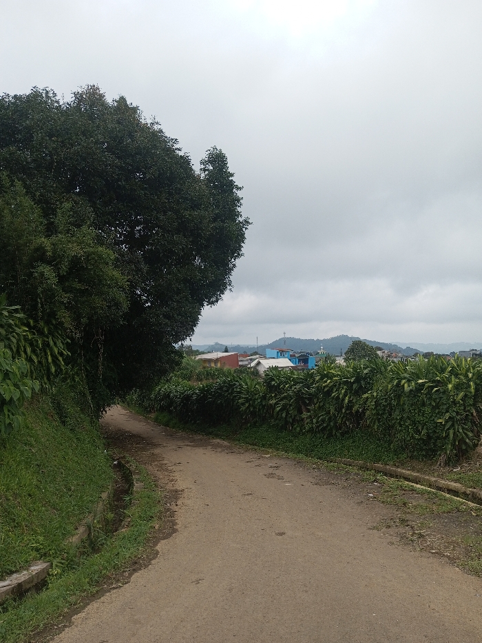 A winding asphalt road curves through a landscape under a cloudy sky. Lush green vegetation flanks the road, with a dense tree canopy to the left and a tall hedge of plants on the right. Buildings are visible in the distance, with rooftops of red and blue. A hill and communication tower are on the horizon. The overall atmosphere is one of tranquility and natural beauty.