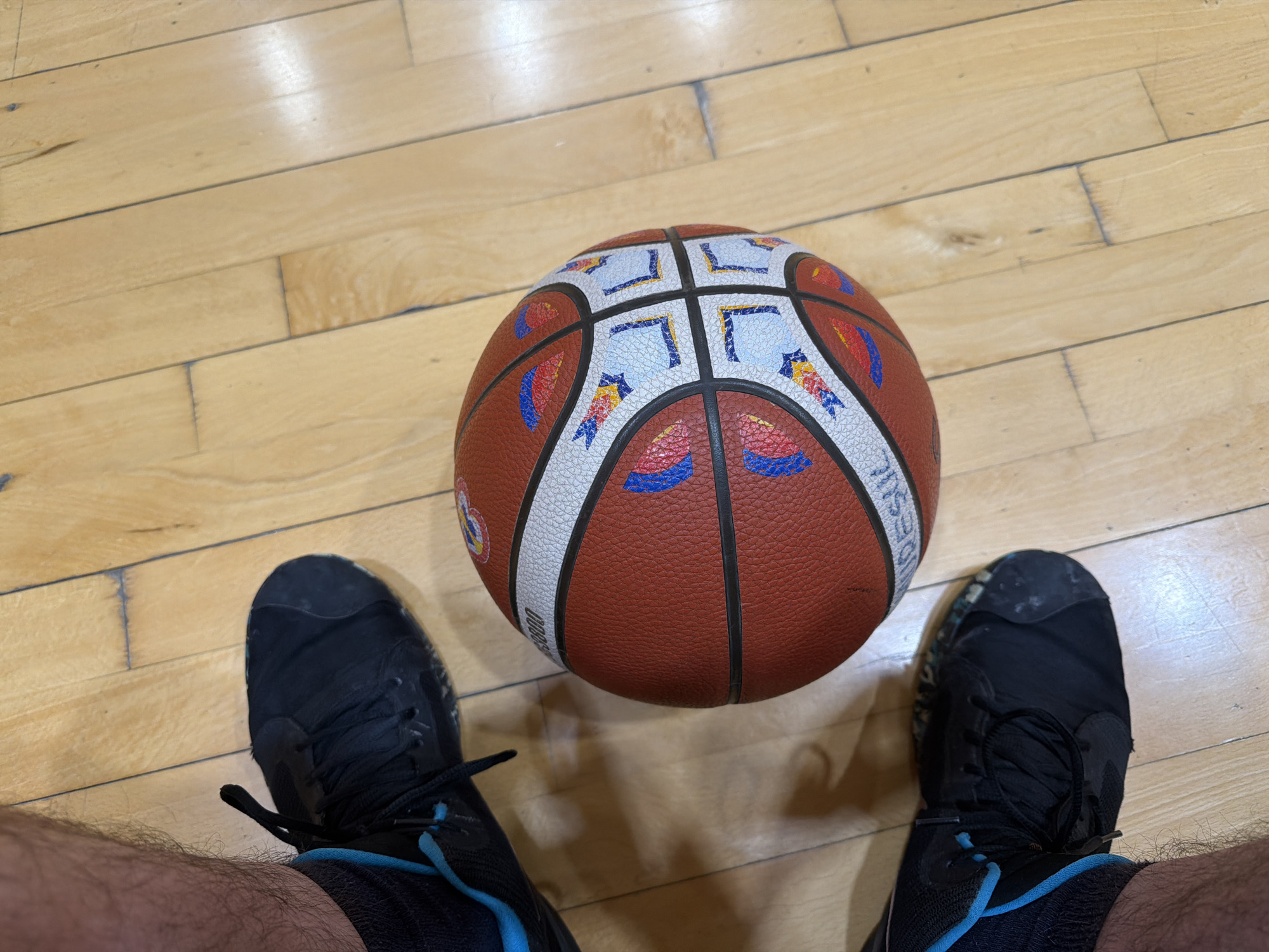 - "basketball on a wooden court, with a pair of black athletic shoes visible at the bottom" by FM-PU0HJ3, licensed under CC BY 4.0