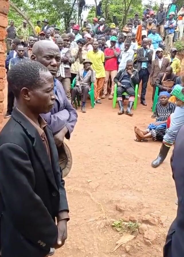 A group of predominantly elderly African men are gathered outside. Some are sitting on green plastic chairs. A bald man in a suit is addressing the crowd. To his right, a spear is stuck into the ground next to a plate of food. Some buildings are visible in the background. The ground is dirt.