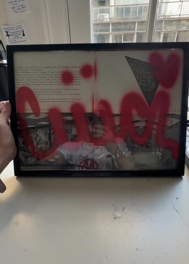 framed picture being held up in front of a window. The picture features a black and white photograph, with red spray paint reading "Clout" obscuring part of the image. Above the photograph, there appears to be a paragraph of text, presumably in French. The person holding the picture is visible as a reflection in the glass. They are wearing a white shirt with a red anarchist symbol on it. The background shows a window with buildings visible outside. A white table sits beneath the frame.