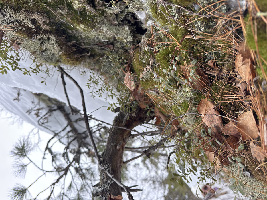 The scene depicts a close-up, low-angle view of a natural environment in Shumikhinskii, Russia, characterized by winter or early spring conditions. The foreground and midground are dominated by dense ground cover consisting of various elements: patches of vibrant green moss, light grey-green lichen formations, clusters of small dark-green evergreen plants with smooth leaves (possibly *Vaccinium vitis-idaea* or similar low-growing shrubs), scattered dry brown deciduous leaves (likely birch), and numerous reddish-brown pine needles. A prominent, gnarled tree branch, rough and partially decayed, with visible bark and exposed wood, extends diagonally from the left-center towards the upper right, also adorned with lichen. In the upper background and extending along the upper right, a significant mass of white snow is present, forming a snowdrift or covering a larger natural feature. Blurred, dark, bare tree branches are visible against a bright, overcast sky in the upper left background. No people, animals, or man-made objects are identifiable within the frame.