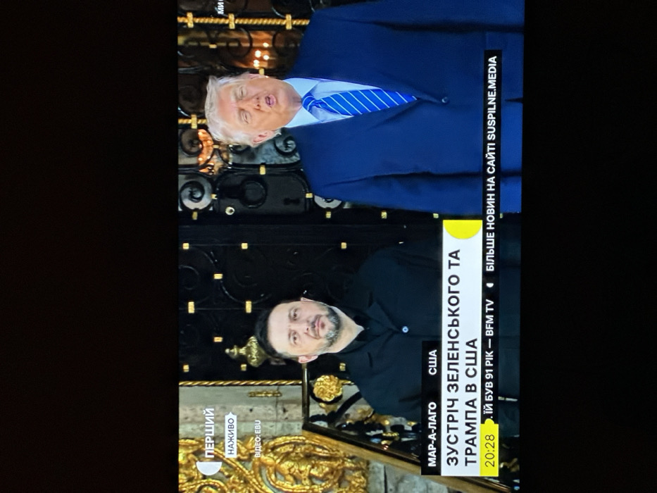 television screen displaying a Ukrainian news broadcast. The screen is split, with a picture of Volodymyr Zelenskyy on the bottom and Donald Trump on the top, both against a decorative background. A news ticker in Ukrainian reads "MEETING OF ZELENSKY AND TRUMP IN THE USA," along with a time stamp and source information. The station's logo and the phrase "LIVE" are also visible.