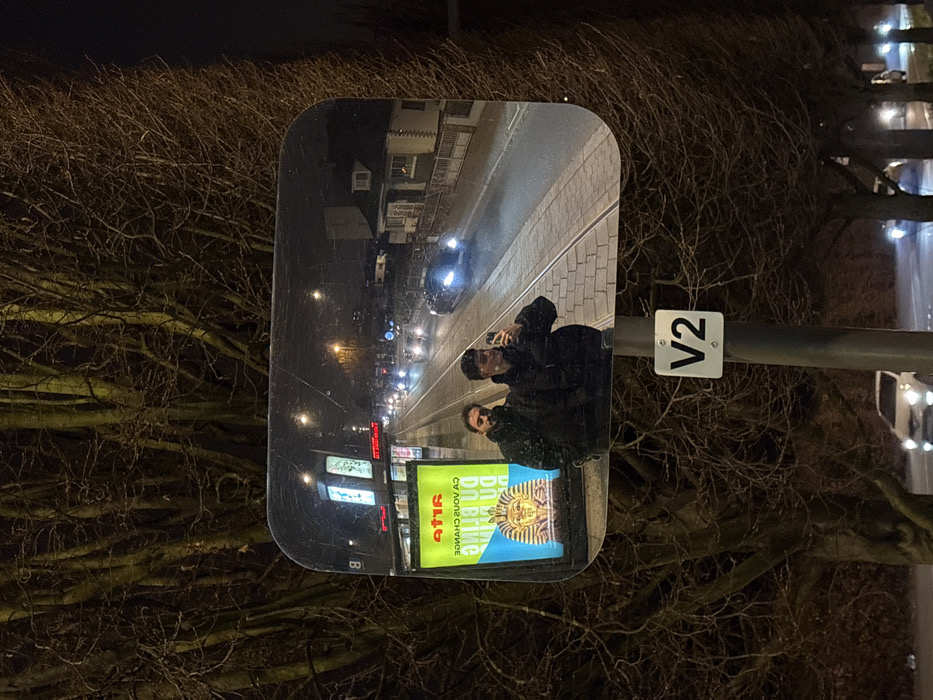 The image depicts a nighttime urban street scene in Bischheim, France, framed by the bare branches of trees, indicating a colder season. Centrally positioned is a rectangular convex traffic mirror mounted on a grey pole, with a white square sign labeled "V2" attached below it. The mirror reflects two male individuals standing side-by-side in the foreground, facing the camera. The person on the left has a beard and is wearing a dark, possibly padded, jacket. The person on the right is holding a smartphone, likely taking a selfie, and is also wearing a dark jacket. The reflection behind the individuals reveals a multi-lane street extending into the distance, with tram tracks running down its center. Vehicles with illuminated headlights are present on the road, indicating active traffic. A dark-colored car with bright headlights is distinctly visible behind the individuals in the reflection. On the left side of the reflected street, a tram or bus stop shelter features illuminated advertising. One prominent advertisement displays a golden pharaoh's mask (Tutankhamun) above French text reading "ARTE ÇA VOUS CHANGE DU BRUIT DU MONDE". On the right side of the reflected street, a residential-style building with a pitched roof and a fence is visible. Outside the mirror's reflection, the dense, intricate network of bare tree branches dominates the upper and side portions of the image. The lower part of the mirror's pole is visible. At the bottom left, the front portion of a white car with illuminated headlights is partially visible, while additional car headlights are discernible in the darker background on the bottom right.