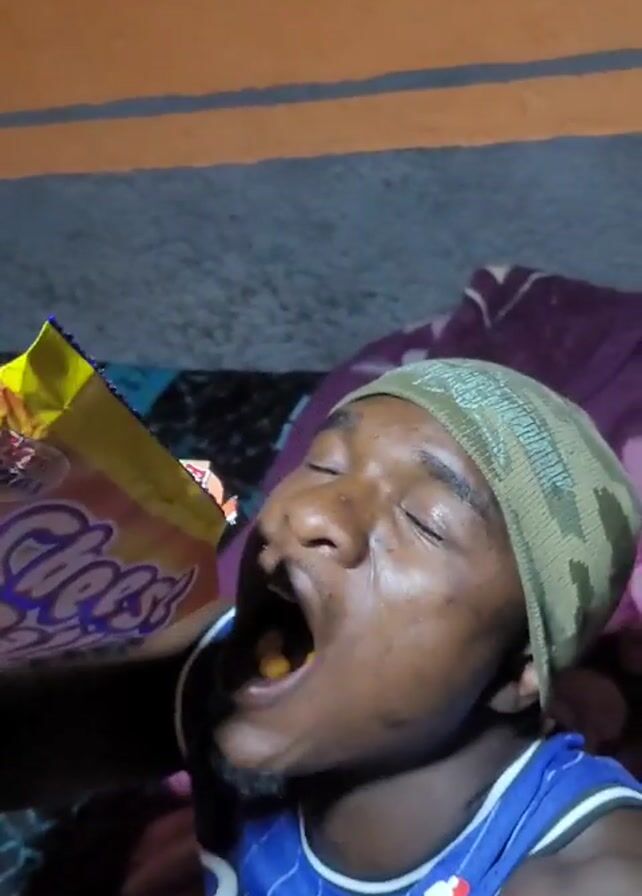 A close-up shot depicts a Black man lying on a bed, eating chips directly from a bag