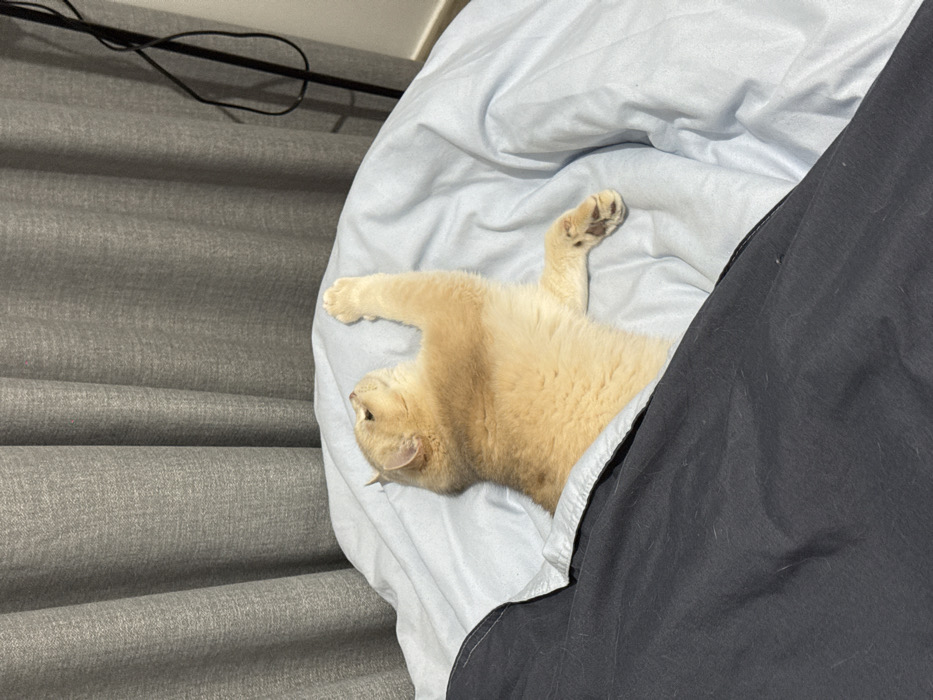 - "A light orange-furred cat is depicted lying supine on a bed" by FM-UFsim1, licensed under CC BY 4.0