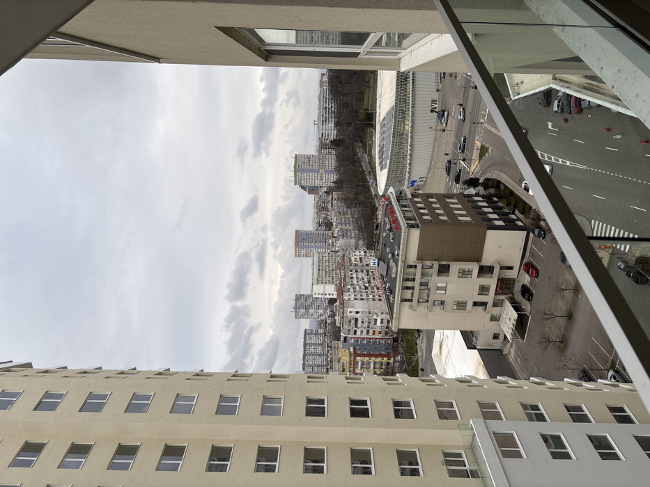 The image depicts an elevated view of a dense urban environment in Burgas, Bulgaria, captured on an overcast day. The perspective is from a high-rise building, with a modern balcony railing featuring a silver-colored top bar and glass panels visible in the immediate foreground. To the left, a tall, light-beige residential building with numerous uniformly rectangular windows extends vertically out of the frame. To the right, a portion of a similar light-beige building, from which the photograph was taken, is visible, including a window frame. The midground features a multi-lane asphalt road, likely Bulevard "Demokratsiya," with white lane markings, pedestrian crosswalks, and traffic signals. Several vehicles, including cars and vans, are present on the road, some in motion, others parked. Adjacent to the road, a cream-colored, six-story commercial building, identified as Hotel България (Bulgaria) by a prominent 'H' sign on its dark roof and "Hotel" visible on a lower sign, is situated. This building displays brown facade accents and features a covered entrance and an associated parking lot containing multiple parked vehicles. Beyond the hotel and road network, a distinctive modern, white, oval-shaped multi-purpose arena, **Arena Burgas**, is visible. Its roof features numerous reflective panels or skylights. To its right, a public park with leafless trees is present, indicative of winter or early spring conditions. The background consists of a dense cityscape dominated by numerous multi-story residential buildings of varying architectural styles and ages, including several prominent high-rise apartment blocks, extending towards a hazy horizon under a heavily clouded sky. No discernible individuals or specific interactions are visible within the frame. The scene is consistent with a typical urban vista in a moderately developed city.