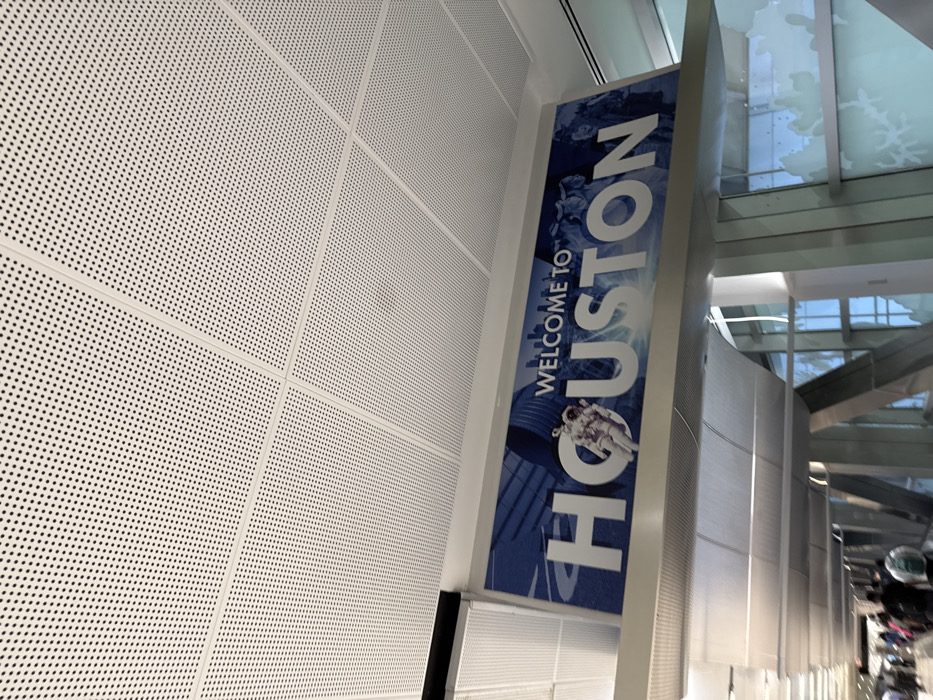 "Welcome to Houston" sign. The sign is blue and white with an astronaut pictured. The sign is tall and vertical, against a white, perforated wall. The background shows an airport interior with glass and metal structures, partially obscured by the sign's structure. The perspective is angled, giving a sense of depth.