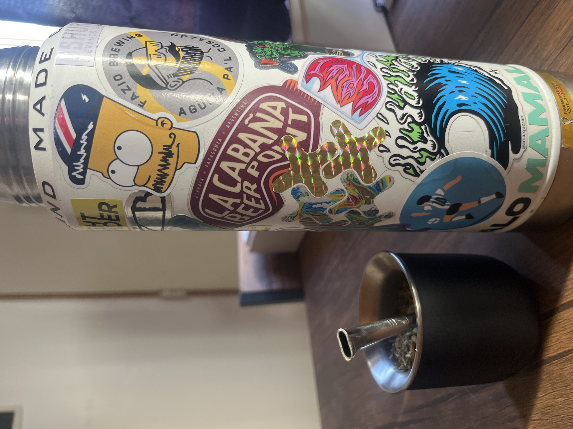 A close-up captures a cylindrical, metal thermos covered in stickers, lying horizontally on a wooden surface next to a black mate gourd with a bombilla (straw)