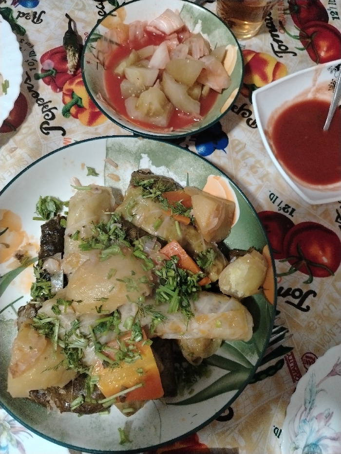 The image depicts a meal served on a patterned tablecloth in Angren, Uzbekistan. A large, round plate, positioned centrally in the foreground, contains several portions of cooked, stuffed rolls, some wrapped in light-colored leaves and others in dark green leaves, interspersed with pieces of cooked potatoes and sliced carrots. These items are garnished with chopped green herbs. In the upper central area, a smaller, round bowl with a patterned rim holds diced light-colored vegetables in a red liquid. To the upper right, a white, square-ish bowl contains a thick red sauce, with a silver spoon partially submerged. A clear glass containing an amber liquid is partially visible behind the smaller bowls. The tablecloth features a repeating pattern of red and yellow bell peppers, red tomatoes, and related text. Portions of two additional white plates are visible on the left and lower right edges of the frame. No individuals are present in the scene.