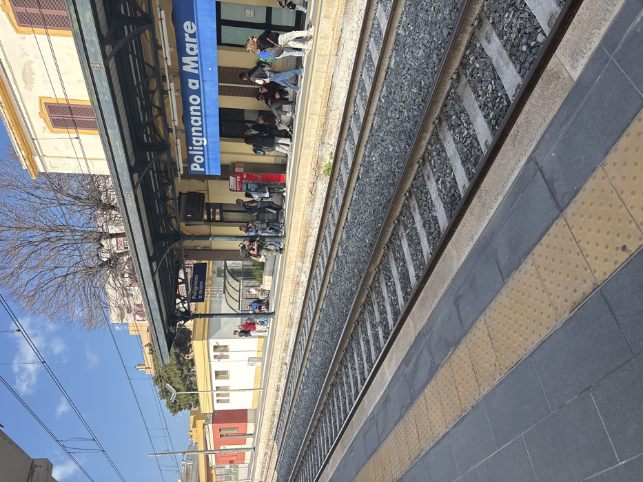 The image displays an outdoor scene at the Polignano a Mare train station in Italy under clear, sunny conditions