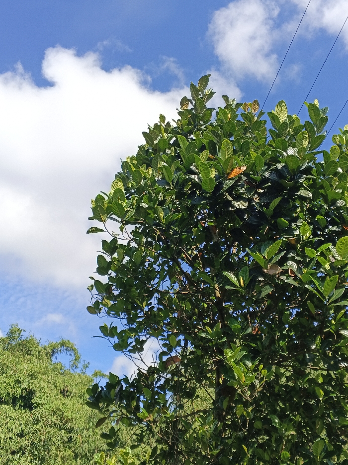 A vibrant green tree dominates the frame, its leaves thick and plentiful. The sky, a brilliant blue, is partially obscured by fluffy white clouds. Power lines run across the top right of the scene. Another tree, smaller and less defined, appears at the bottom left. The overall composition is bright, with sunlight illuminating the scene.