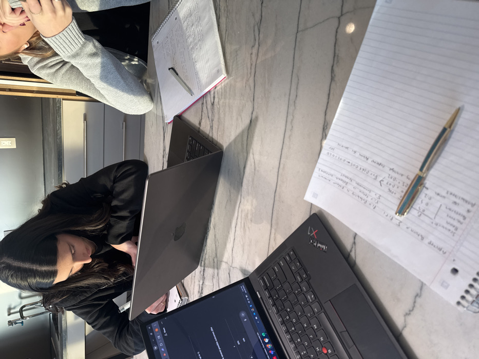 The image depicts two individuals engaged in academic or professional tasks at a light-colored, marble-patterned countertop. **People:** On the left, a person with long dark hair, wearing a black long-sleeved top (possibly a hoodie), leans forward, actively writing in a spiral notebook. A silver Apple MacBook is open directly in front of this individual. On the right, a second person is partially visible from the chest up, wearing a grey ribbed long-sleeved garment, with their right hand raised to their face. **Subjects/Objects:** Two open laptops are on the countertop: a black Lenovo ThinkPad X1 in the foreground, displaying a dark-mode interface with tabular data, and the silver Apple MacBook situated between the two individuals. Three open spiral notebooks are visible: one directly in front of the writing individual, another with handwritten formulas and a gold-and-teal pen resting on it in the bottom right, and a third with handwritten notes and a grey pen in front of the partially visible right individual. The countertop is polished and reflects light. In the background, a modern kitchen area is visible, featuring a stainless steel faucet, a sink basin, light-colored flat-panel cabinets with horizontal metal handles, and a wall outlet. **Actions/Interactions:** The person on the left is actively writing. The person on the right appears to be contemplating or resting, with no direct interaction visible between the two individuals. **Environment:** The scene is indoors, likely a kitchen or study area, illuminated by strong natural light entering from the right, casting distinct shadows across the countertop. **Location:** The specific location within the city of Boston, United States, cannot be determined from the visual evidence provided.