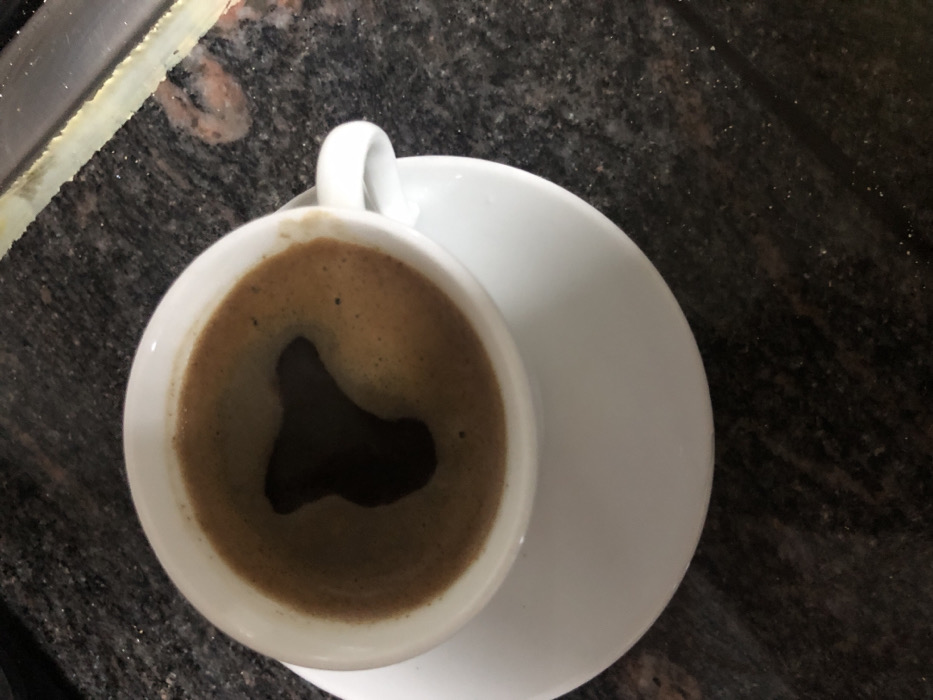 A white ceramic cup containing dark brown liquid topped with a lighter brown foam layer, featuring a dark, irregularly shaped void resembling a distorted 'Y' or triangle in the foam, rests centered on a matching white ceramic saucer