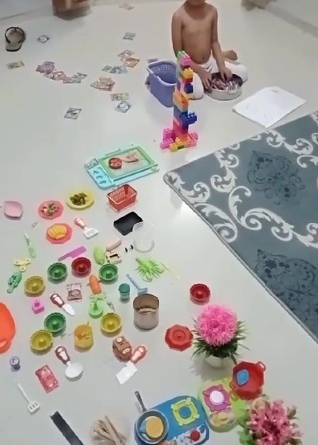 child sitting on a tile floor surrounded by toys. The child is a toddler with short dark hair, wearing only a diaper. Around the child are a variety of toys: building blocks, play food, miniature kitchen items like pots and pans, flowers in vases, and what appear to be play money or cards scattered around. A small blue and white rug is also on the floor. A brown curtain is to the right and left of the child. A doorway in the background leads to a room with a brown tufted sofa. The person holding the camera can be heard asking the child "What are you doing?"