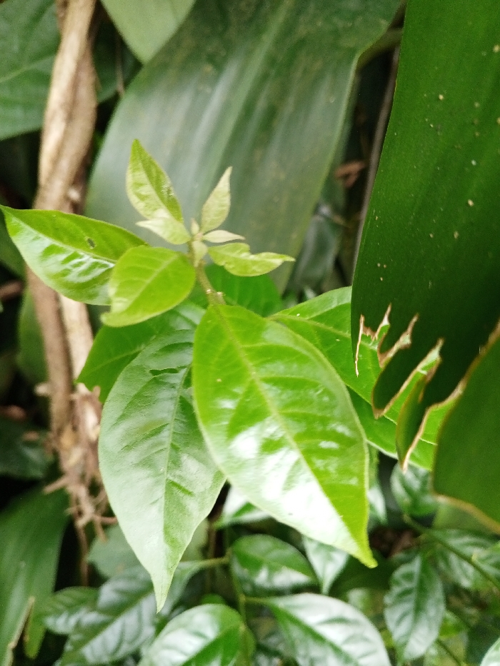 Lush green foliage fills the frame, dominated by glossy, oval leaves. A cluster of smaller, lighter green leaves sprouts from a central stem. A textured, light brown stem is visible in the background, along with a large, smooth leaf. Another large leaf, with jagged, damaged edges, is positioned on the right. The light reflects strongly off the leaves, emphasizing their smooth surface.