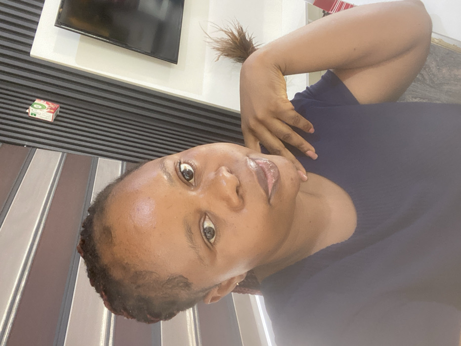 The scene depicts an indoor environment in Gwarinpa, Nigeria. A dark-skinned female individual is positioned from the chest up, directly facing the camera. She has dark hair styled in braids and wears a dark, short-sleeved garment. Her left hand is raised, with fingers resting against her chin and jawline. In the background, a section of horizontal striped blinds or panels is visible on the left. To the right, a dark vertical slatted wall feature is present, with a small, white, rectangular juice carton, bearing green and red branding, affixed to it. Further to the right, a black flat-screen television is mounted on a white wall or panel. A brown, feathery decorative plume is situated to the right of the individual's arm, and a white surface along with a red and white striped object are partially visible in the lower right background.