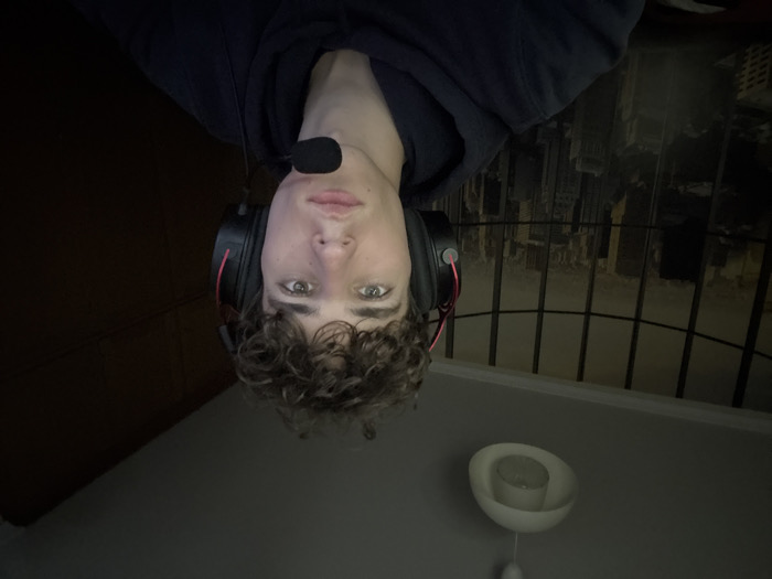 This image depicts a young male seated indoors in Mirandela, Portugal. The individual has light skin, dark curly hair, and light eyes, and appears to be in his late teens or early twenties. He is wearing a dark blue hooded sweatshirt and black over-ear headphones with red accents, equipped with a small black boom microphone positioned near his mouth. He gazes directly forward towards the camera. The background on the left features a wall adorned with wallpaper displaying a stylized dark cityscape viewed through a grid pattern. The right side of the background is dark and indistinct, possibly a shadowed wall or furniture. A white, modern, domed ceiling light fixture is visible in the upper left. The overall lighting is dim, suggesting an indoor setting with ambient light sources, possibly from a screen not visible within the frame. No discernible interactions are occurring.