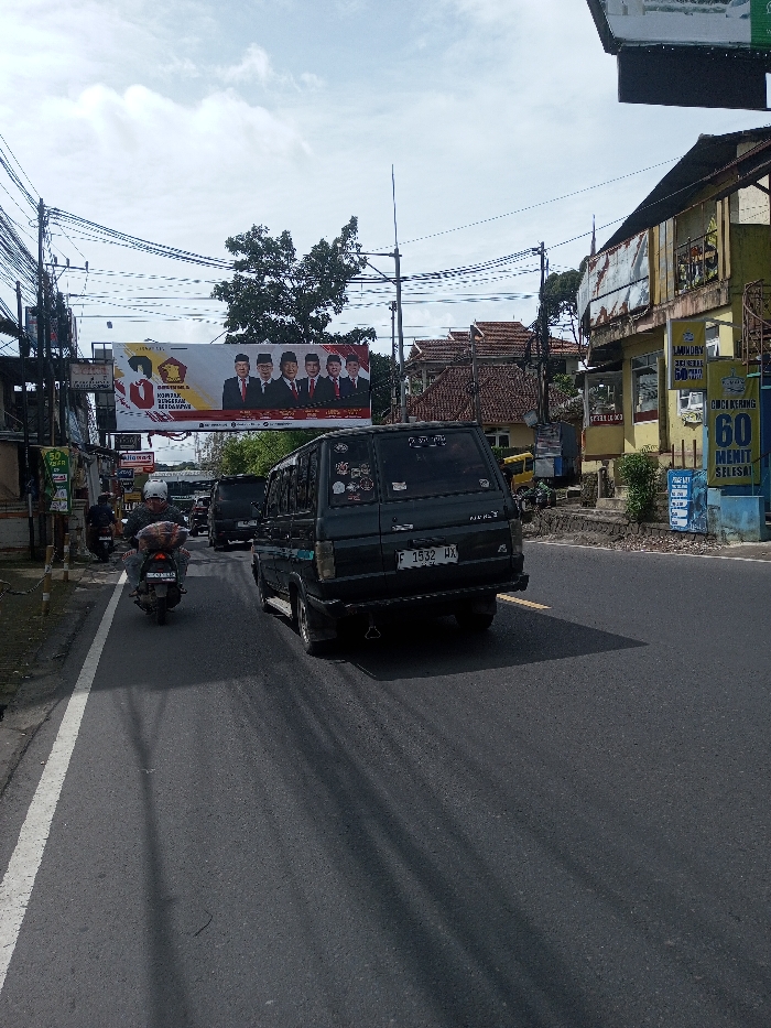 street scene with a black van and a motorbike in the foreground. A large political banner stretches over the road, displaying images of several men in suits. Buildings line the street, with a laundry sign advertising a 60-minute service. Utility poles and wires are visible above. The license plate on the van reads "F 1532 HX". Signs with the text "50" and "60" are apparent.