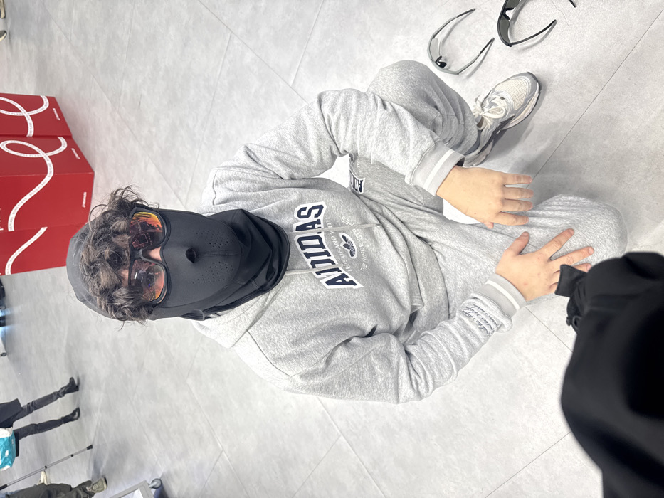A person wearing a grey Adidas tracksuit, black balaclava, and orange tinted sunglasses sits cross-legged on a light grey floor
