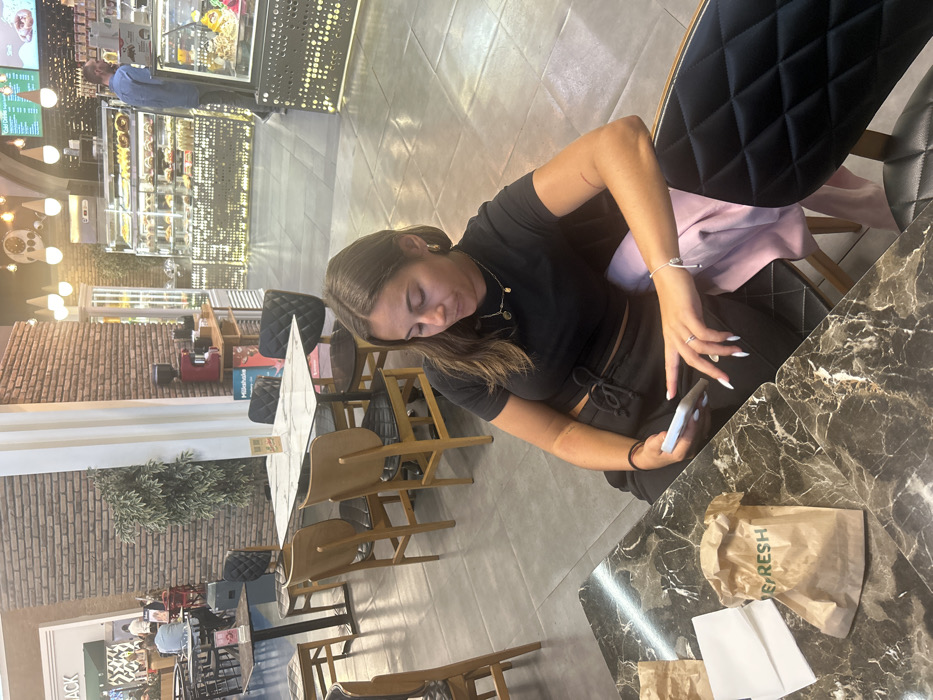 The image displays an indoor commercial dining area within a cafe or food court located in Arnavutköy, Turkey. In the immediate foreground, a young adult female is seated at a black marble-patterned table, looking downward at a white smartphone she holds with both hands. She wears a black short-sleeved t-shirt, black drawstring sweatpants, a gold-colored necklace with two small circular pendants, gold hoop earrings, a silver bracelet on her left wrist, and a ring on her right ring finger. Her fingernails are long and painted white. On the table to her left, a crumpled brown paper bag with "FRESH" printed on it and several white paper napkins are present. A light pink garment is draped over the armrest of the black quilted chair positioned to her right. The background reveals a brightly lit counter area of a cafe or dessert shop, featuring multiple refrigerated display cases filled with various pastries, donuts, and other sweet items. A male figure in a blue shirt is visible standing near these display cases. Above the counter, a menu board with green sections displays text. To the left of the counter area, a red coffee machine is situated on a wooden stand. The general environment features grey tiled flooring, walls constructed with a combination of red-brown brickwork and light vertical panels, and several seating arrangements comprising tables with white marble-patterned tops and chairs with both wooden frames and black upholstered backs/seats. Decorative overhead lighting fixtures illuminate the space, and additional patrons are vaguely visible further in the background.
