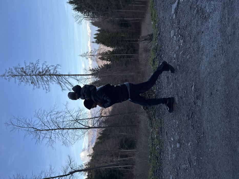 An adult male is seen striding rightward on a gravel and dirt path, carrying a small child on his shoulders. The male wears a dark puffer jacket, dark trousers, and dark shoes, with a dark beanie covering his head. The child, dressed in a dark puffer jacket and beanie, faces slightly forward from the adult's shoulders. The scene is set in a mountainous, forested environment, specifically identified as being near Bellagio, Italy. The midground features a dense forest composed of both bare deciduous trees and evergreen conifers. In the background, snow-capped mountain ranges are visible beneath a clear blue sky. Natural daylight illuminates the subjects from the left, casting minimal shadows.
