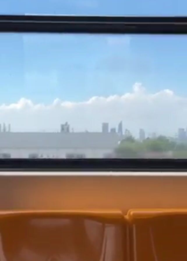 view from inside a train. The camera looks out of the train window at the city skyline in the distance. The skyline is faint, and clouds fill most of the sky. The train is moving, as the view outside changes. There is a large white water tower that comes into view. The seats inside the train are orange.