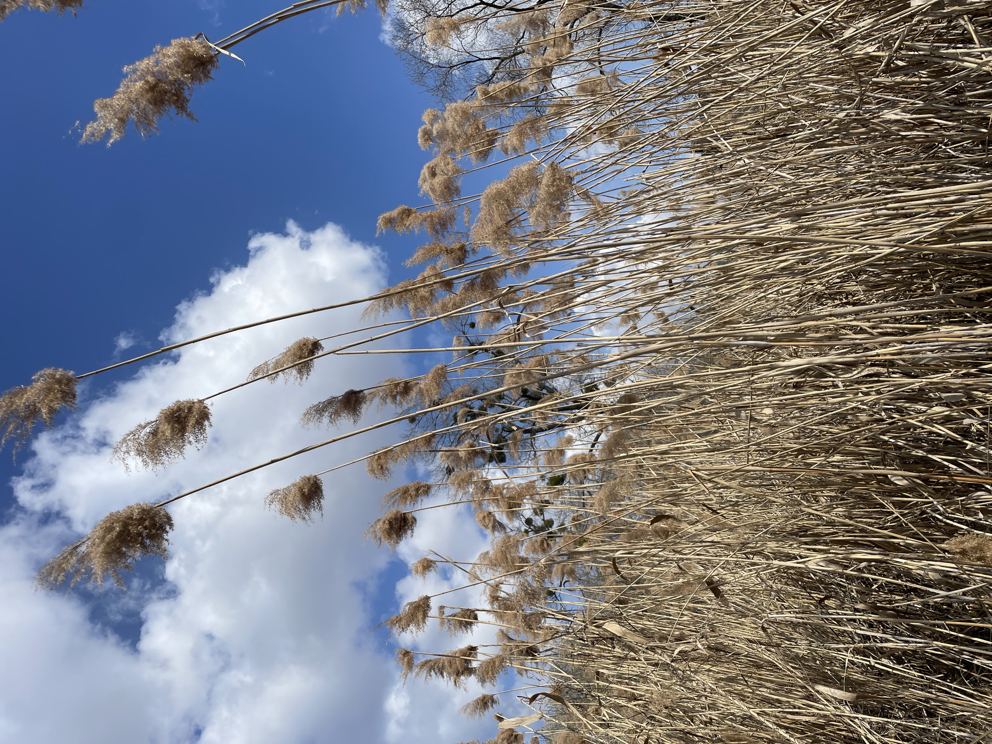 The image depicts a natural outdoor scene in Vinnytski Khutory, Ukraine, viewed from a low perspective. The dominant subjects are numerous tall, dry reeds (*Phragmites australis*) with tan stalks and light brown, feathery seed heads (plumes) occupying the lower two-thirds of the frame. These reeds are densely packed and appear to be swaying or leaning towards the left due to wind, with some plumes exhibiting slight motion blur. In the background, particularly on the right side, are leafless deciduous trees with dark, bare branches silhouetted against the sky. Patches of green foliage, possibly mistletoe, are visible on some tree branches. The upper third of the image shows a clear, vibrant blue sky interspersed with scattered white cumulus clouds. The scene is brightly illuminated, indicating daylight. No individuals or man-made structures are visible.