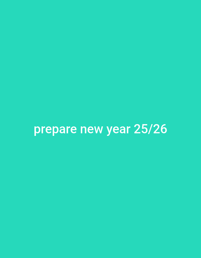 A solid aquamarine background occupies most of the frame. In the center, white text reads "prepare new year 25/26". The text is simple and sans-serif. The overall impression is minimalist and functional.
