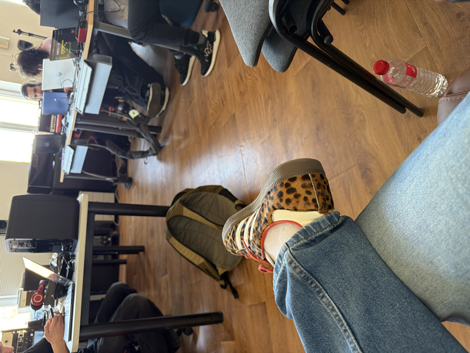 An interior scene depicts a collaborative workspace or classroom setting within a building in Sofia, Bulgaria. The image is captured from a low vantage point, focusing on the foreground where a person's lower legs and feet are visible. The individual wears blue denim jeans and a leopard-print low-top sneaker featuring white stripes, red trim around the eyelets, and a gum sole, paired with white socks. A khaki-colored backpack with dark straps rests on the polished wooden floor directly in front of the viewer's feet. To the immediate right, a clear plastic water bottle with a red cap is on the floor, positioned near the legs of a dark-framed, stacked chair. In the midground, multiple dark-legged tables are arranged. Each table is occupied by individuals interacting with laptops and other electronic equipment. On the left, a person wearing a dark shirt is seated, operating a laptop with a brightly illuminated screen. Red headphones and a black desktop computer tower are positioned on this table. Further to the right, another individual with dark, curly hair and a beard is visible, concentrating on a laptop screen. Additional indistinct figures are present, also engaged with computers. Various technical devices, including a Marshall amplifier and other audio equipment, are visible on and beneath the tables. Electrical cables and wiring are present on the floor and under the desks. The background features bright windows along a white wall, admitting natural light into the room. The overall environment suggests a functional and active technical or studio space.