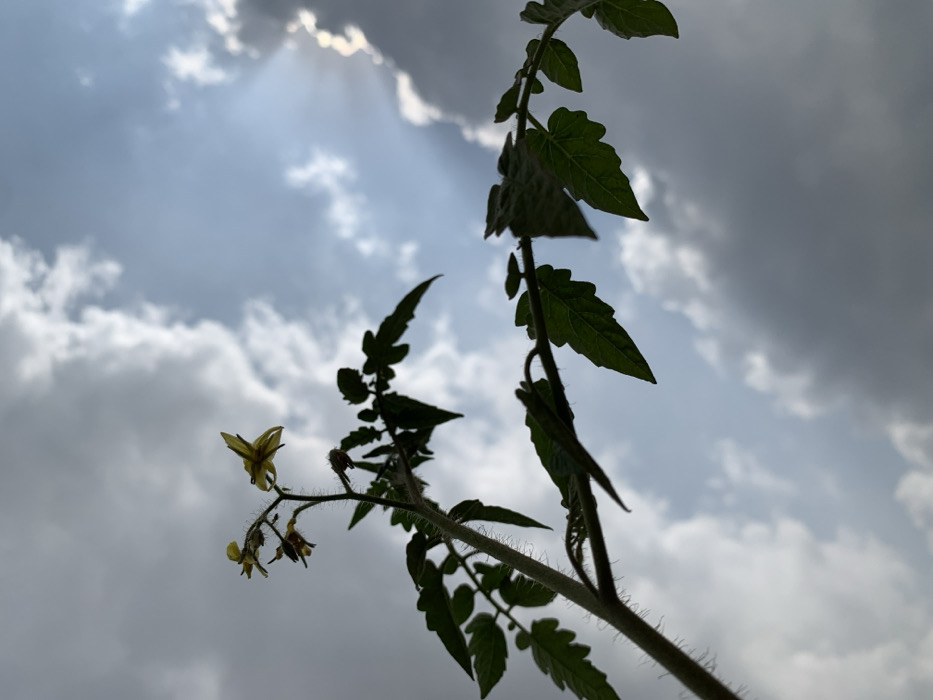 A low-angle, back-lit photograph taken in the city of Unknown, Unknown, captures a section of a green plant, likely a tomato, against a cloudy sky. The plant occupies the foreground, extending diagonally from the lower left to the upper right. Its stem is visibly hairy, with serrated green leaves branching off. Several small, yellow, five-petaled flowers are present towards the upper left, some fully open, others appearing as buds. The background consists of a partially overcast sky featuring a mixture of bright white and darker grey clouds. Sunlight is visible breaking through the clouds in the upper right quadrant, casting distinct rays of light. No people, objects other than the plant, or discernable actions or interactions are present in the static scene.
