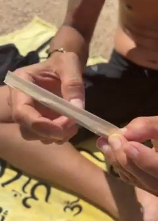 person on a beach rolling something